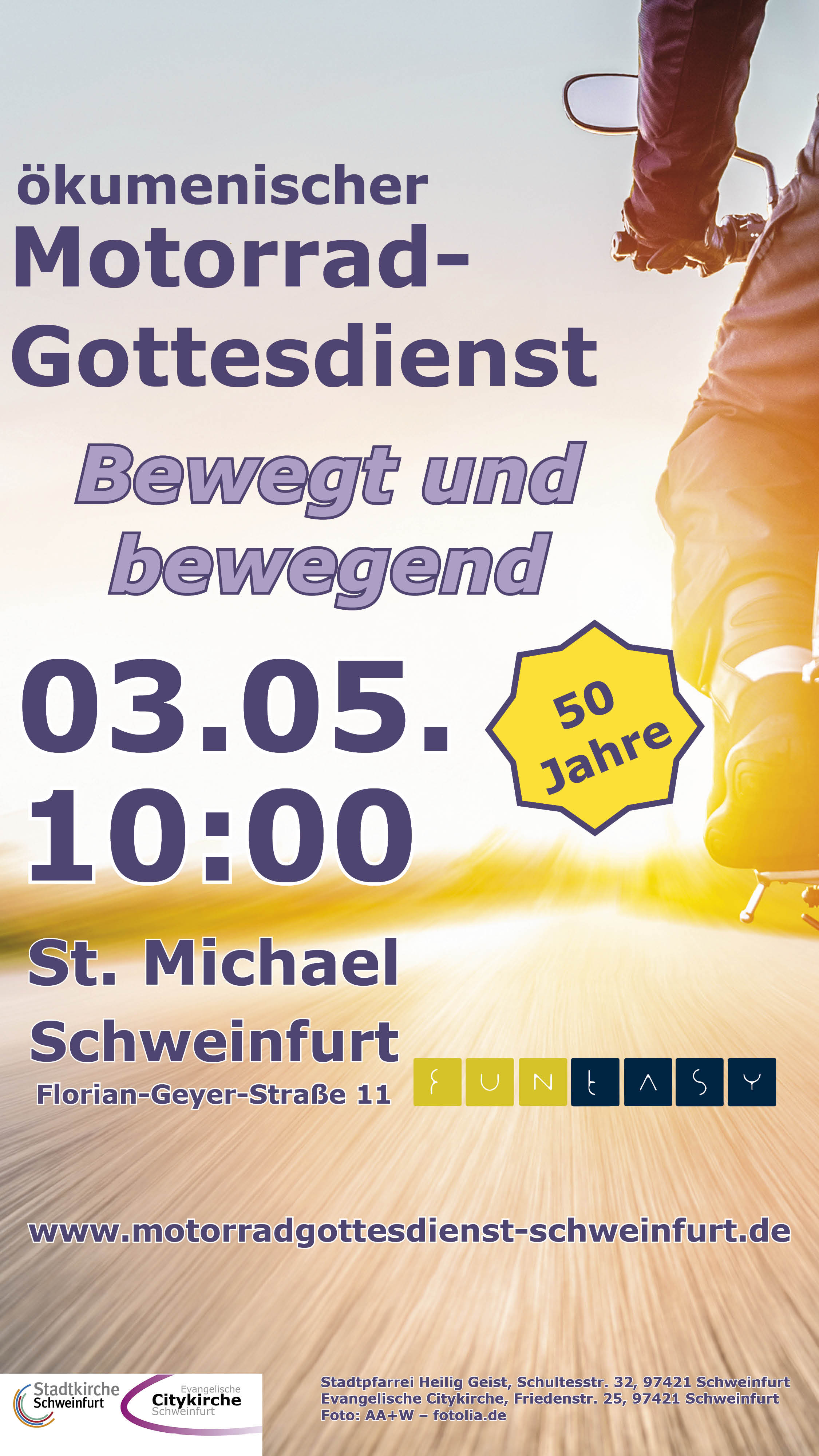 Schweinfurt – Ein besonderes Jubiläum steht in diesem Jahr beim Motorradgottesdienst in Schweinfurt an: Am Sonntag, 3. Mai 2026, wird der Gottesdienst zum Saisonbeginn 50 Jahre alt. Beginn ist um 10 Uhr in der Kirche St. Michael in Schweinfurt.