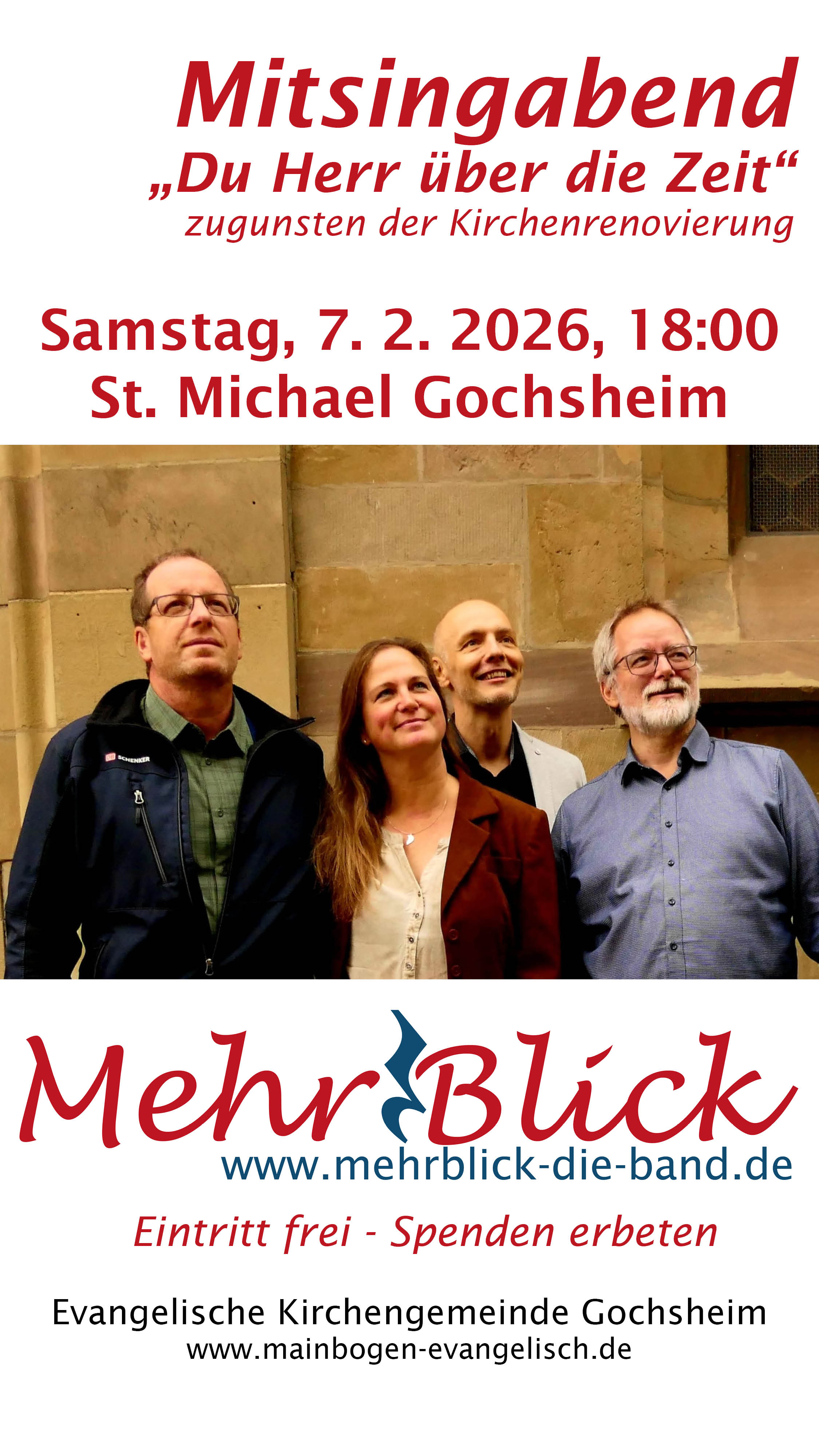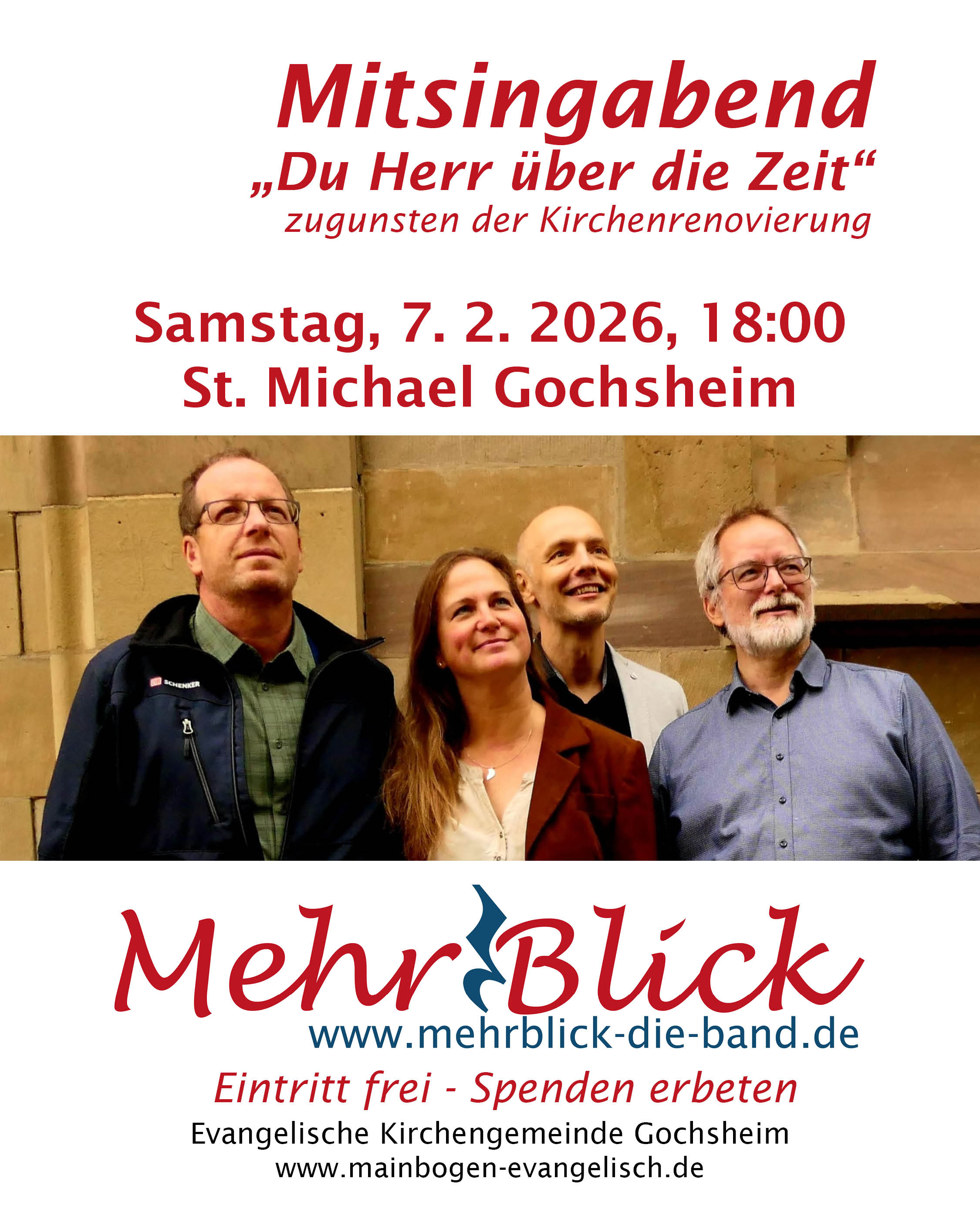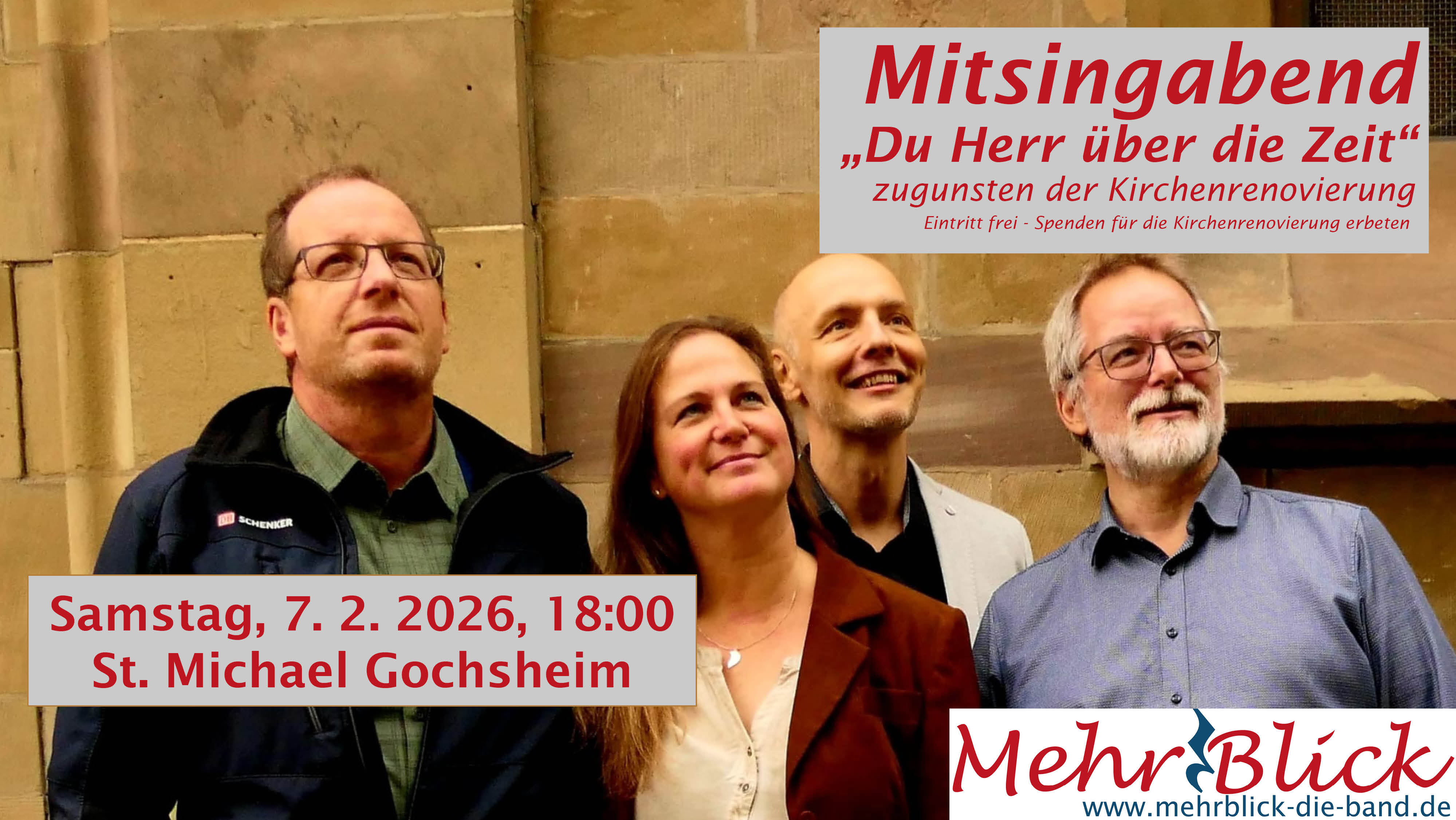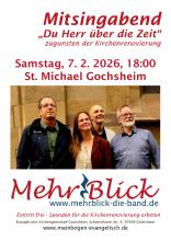 Nach längerer Pause kehrt die Gochsheimer „Kirchenband“ MehrBlick in ihre Heimatkirche zurück. Sandy und Klaus Fiedler, Martin Thys und Heiko Kuschel laden unter dem Titel „Du Herr über die Zeit“ zu einem besonderen Mitsingabend ein, der an die frühere Tradition anknüpft.