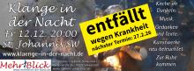 Schweinfurt. Die diesjährige Adventsausgabe von „Klänge in der Nacht“, der musikalisch-literarischen Kirchenführung im Dunkeln mit der Band MehrBlick, muss leider wegen Krankheit entfallen. Der nächste Termin ist am Freitag, 27.2.2026, 20 Uhr in St. Johannis Schweinfurt.