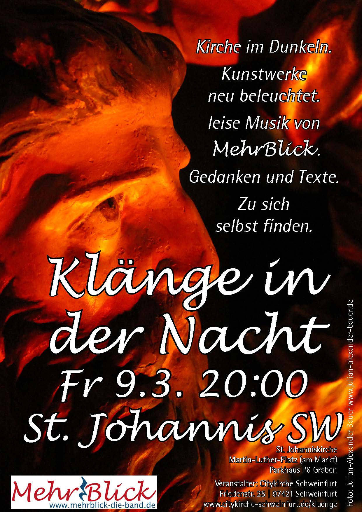 Mitten in der Nacht erwachen in der dunklen Johanniskirche einzelne Figuren zum Leben. Ausschnitte aus Kunstwerken der Johanniskirche werden beleuchtet. Ungewohnte Perspektiven auf die Kunst und auf das eigene Leben entstehen. Literarische Texte verweben sich mit leiser Musik der Band MehrBlick in kleiner Besetzung.