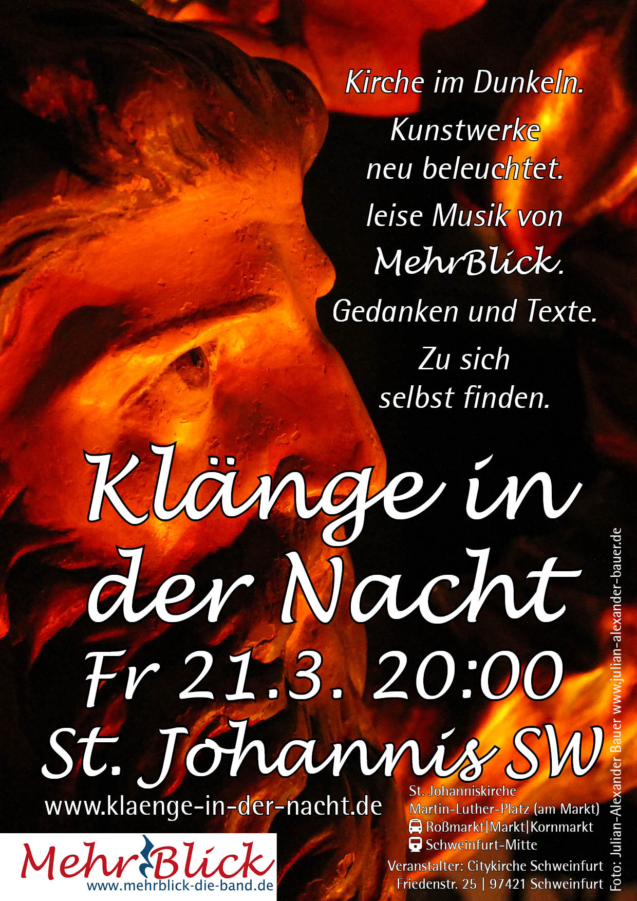 Mitten in der Nacht erwachen in der dunklen Johanniskirche einzelne Figuren zum Leben. Ausschnitte aus Kunstwerken der Johanniskirche werden beleuchtet. Ungewohnte Perspektiven auf die Kunst und auf das eigene Leben entstehen. Literarische Texte verweben sich mit leiser Musik der Band MehrBlick in kleiner Besetzung.