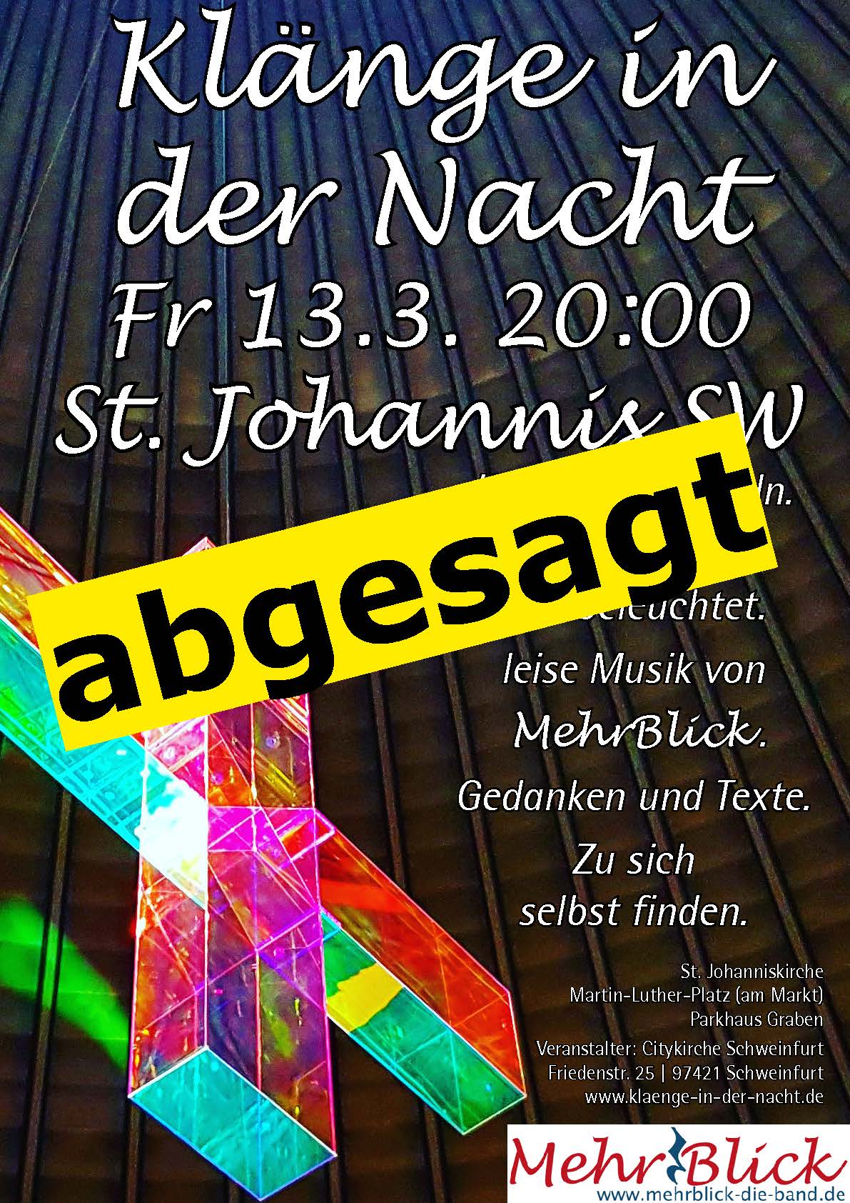 Nach den neuesten Entwicklungen im Lauf des Donnerstag haben wir uns, trotz der positiven Einschätzung des Gesundheitsamts und unserer gegenteiligen Meldung vom Donnerstag Mittag, dazu entschlossen, die "Klänge in der Nacht" am 13. März aufallen zu lassen.