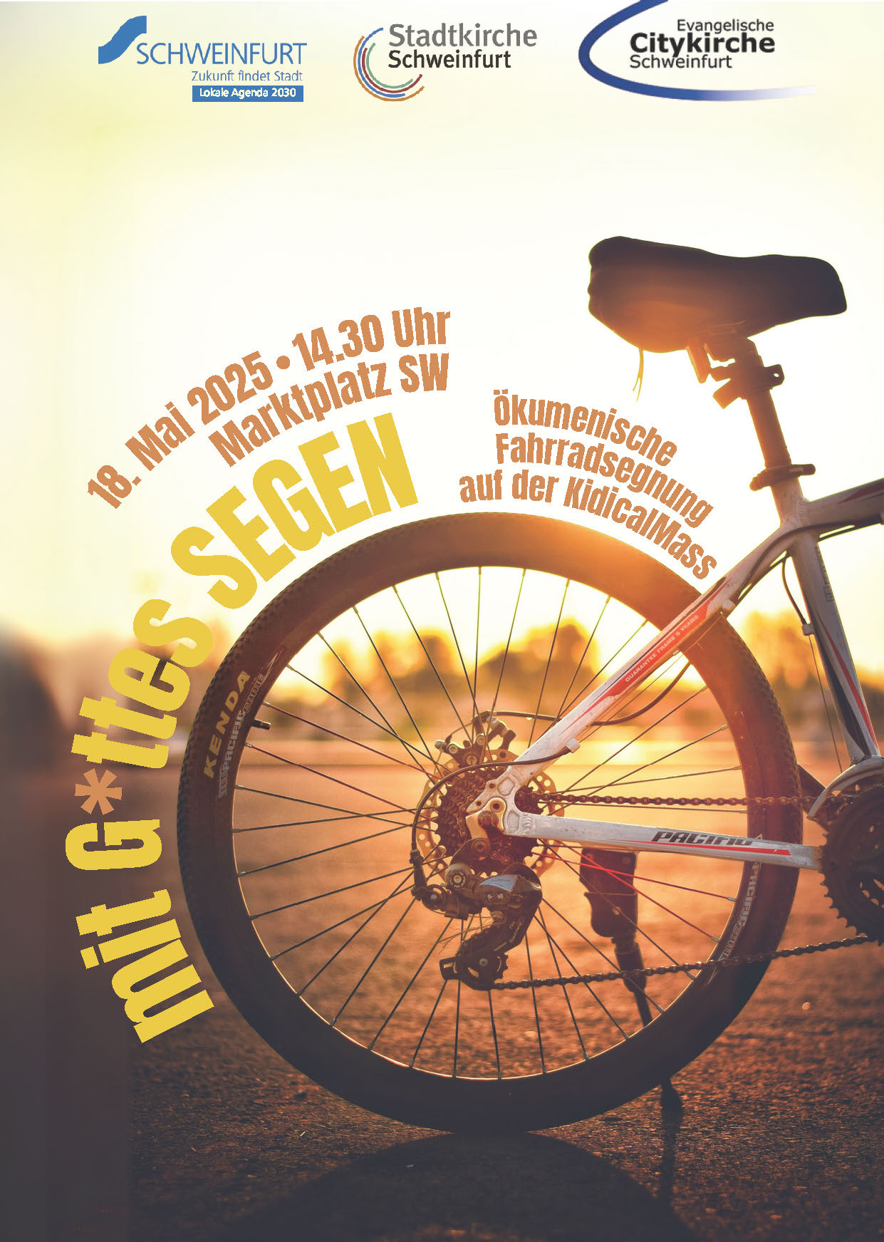 Zum zweiten Mal gibt es im Rahmen der Fahrrad-Demo „Kidical Mass“ am 18.5. um 14:30 eine ökumenische Andacht auf dem Marktplatz. Pfarrer Heiko Kuschel und Jugendseelsorger Thorsten Kneuer freuen sich auf alle, die in die Fahrrad-Saison mit einem persönlichen Segen starten wollen. Aber auch ohne Rad dürft ihr natürlich gerne teilnehmen!