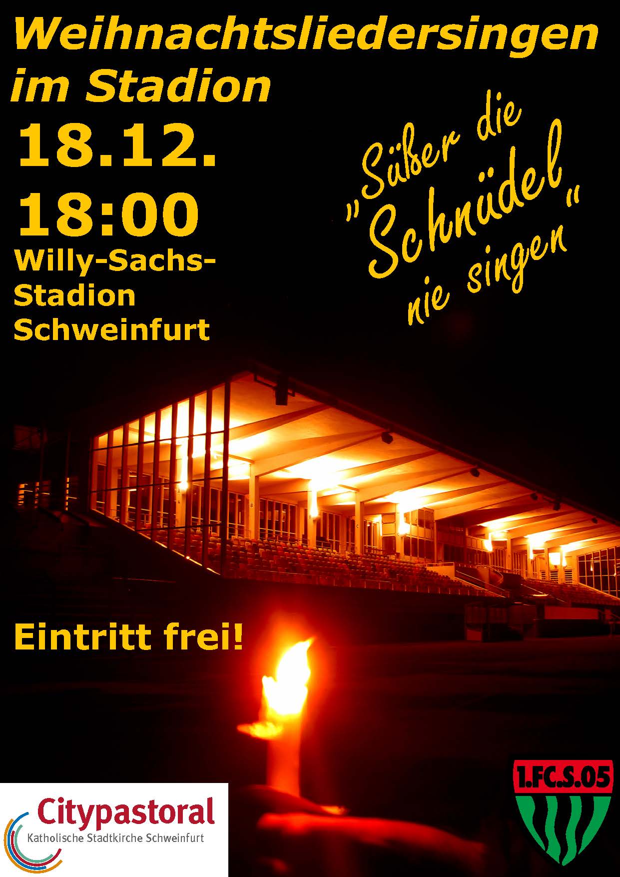 Weihnachtslieder singen im schönen Willy-Sachs-Stadion. Die Atmosphäre genießen mit vielen anderen, die gerne singen. Gemeinschaft spüren und erleben. Dazu gibt es den einen oder anderen Impuls für die (vor-)weihnachtliche Zeit. Natürlich auch Glühwein und Bratwurst, so wie es sich eben für einen Stadionbesuch gehört. Zusammen mit dem evangelischen Posaunenchor und verschiedenen Sängerinnen und Sängern soll die Freude auf das Weihnachtsfest, die Geburt Jesu, durchscheinen. Sie sind herzlich eingeladen, an diesem Abend ins Stadion zu kommen.